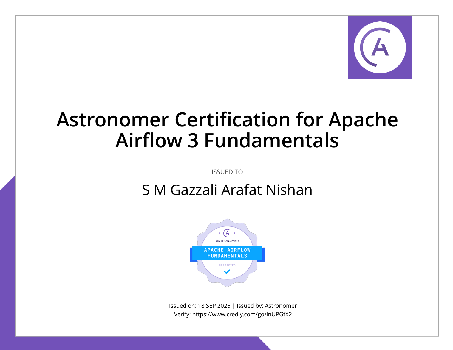 Airflow 101 (Airflow 3) | Astronomer Certification for Apache Airflow 3 Fundamentals | Verify | Download | 2025-09-18 | No Expiry | Astronomer | Online Proctored |