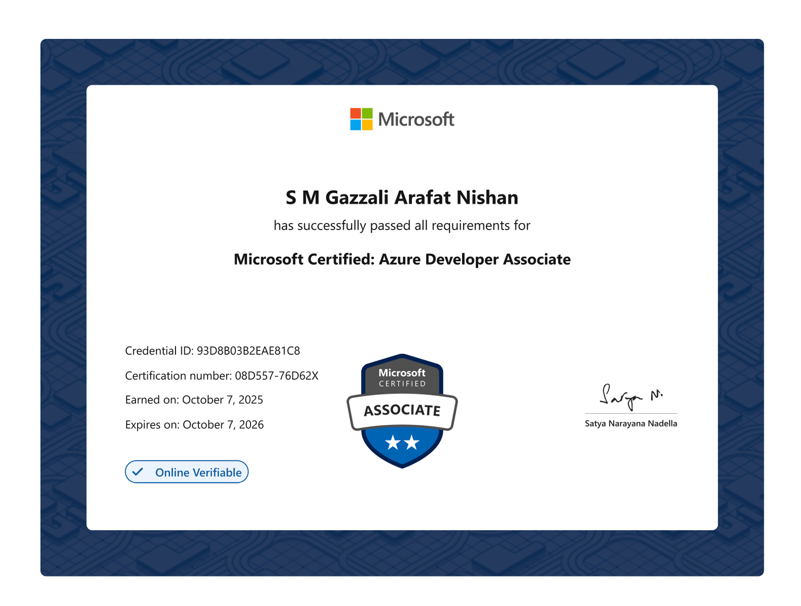 | AZ-204 | Microsoft Certified: Azure Developer Associate | Verify | Download | 2025-10-07 | 2026-10-07 | Microsoft | Online Proctored by PearsonVUE |